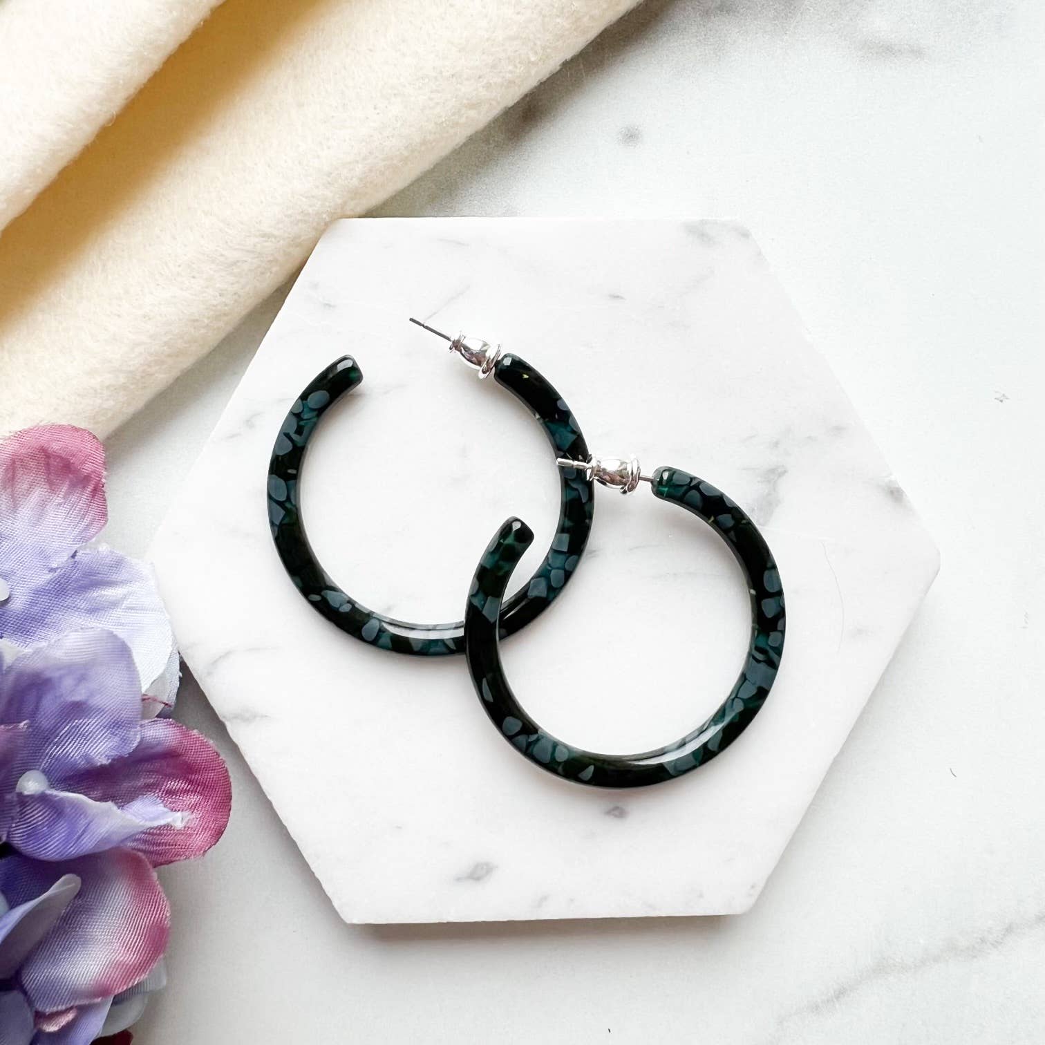 Size 40mm 925 silver posts All of our pieces are made from cellulose acetate. A mixture of cotton pulp and acetic acid. It is a biodegradable and eco-friendly material. Acetate is lightweight yet durable. Our acetate is sourced from Italy and Japan and then manufactured and finished in both China and Idaho. We are a small, Woman-Owned business located in Boise.