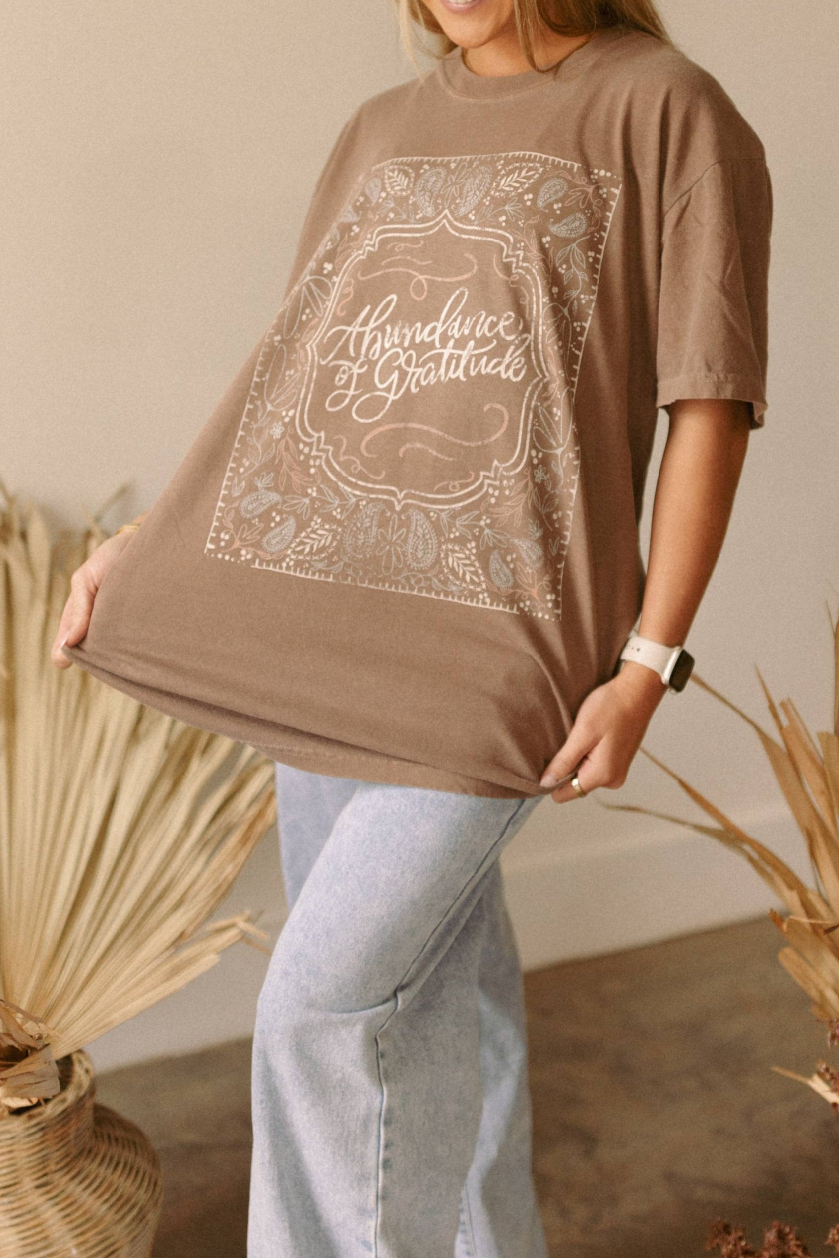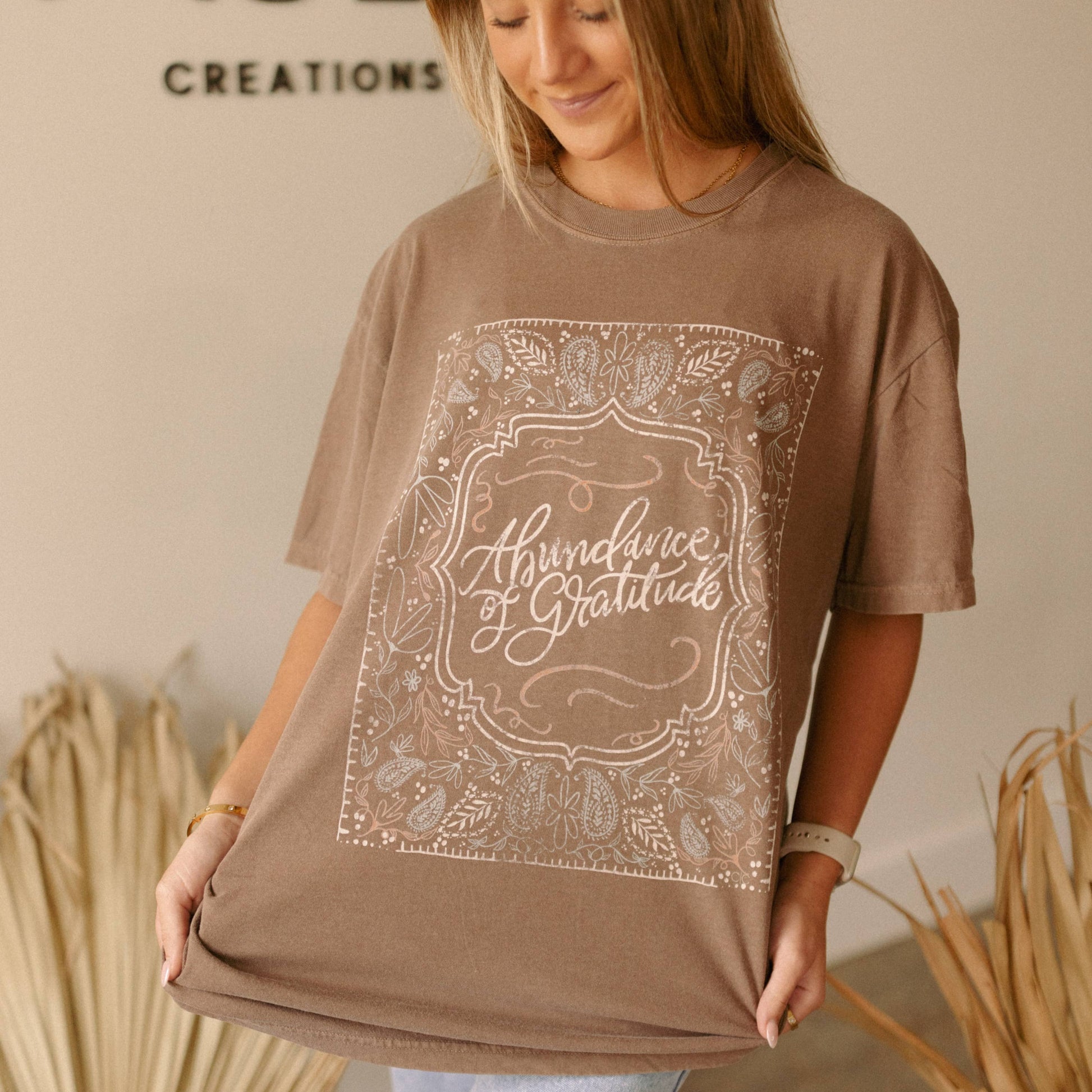 Embrace a grateful attitude with this beautiful paisley "Abundance of Gratitude" shirt. Featuring a vintage brown wash and made of 100% ring spun cotton, it's a must-have from our Fall + Autumn Collection.