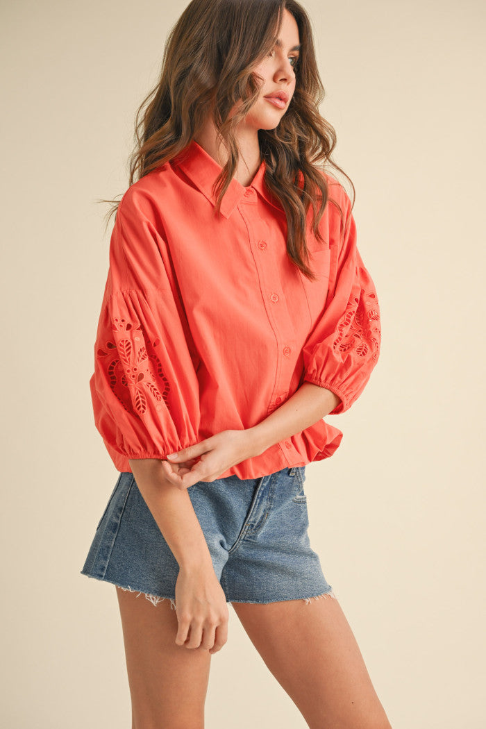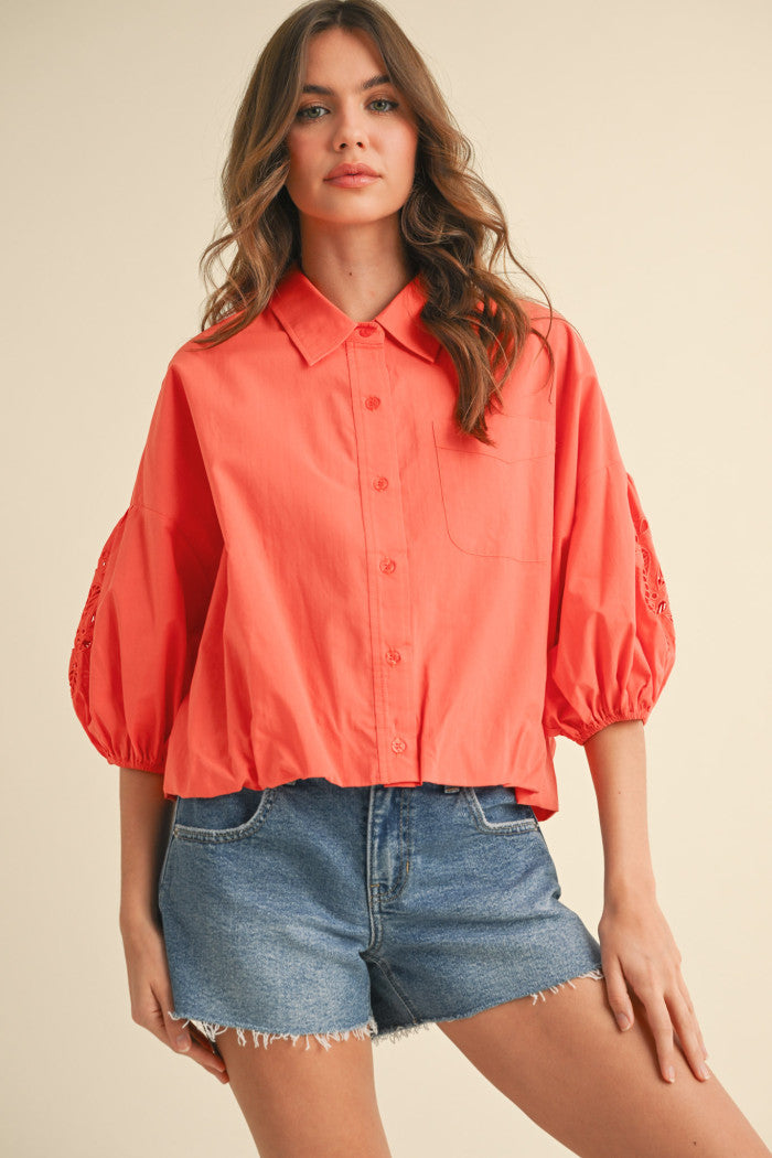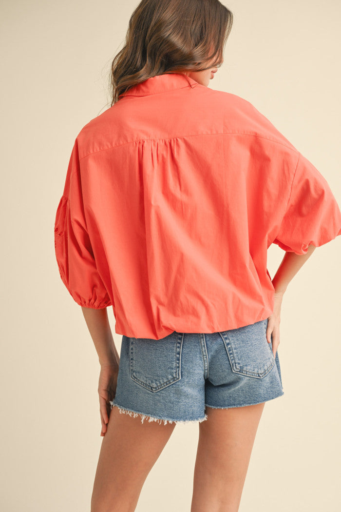Be effortlessly feminine in our Darla Collared Bubble Blouse. With its button up design and playful bubble hem, this blouse is both comfortable and stylish. The embroidered detailing on the sleeves adds a touch of charm, making it the perfect addition to your wardrobe!