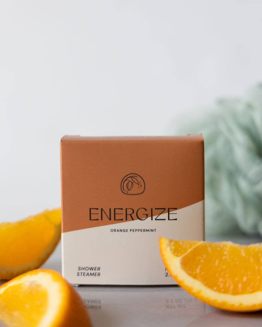 Our invigorating Energize Shower Steamer is the perfect way to wake up with a simple addition to your shower routine. Great for a morning blast to start the day, restore your senses with an orange and peppermint blend that gives you a boost with a fusion of energized sweetness to keep you refreshed throughout the day. With a fruity scent and spice that ignites power with every steam, you’ll experience an uplifting feeling each time you cleanse. The confidence to take on any obstacle starts with a great shower that helps reimagine any hurdle ahead. Place steamer in the shower out of the direct stream of water. Apply a few drops of water to activate. Breathe deeply and enjoy. Warning: Due to the high concentration of essential oils this product is not safe for use on skin. Do not use in a bath. Ingredients: Sodium Bicarbonate, Citric Acid, Citrus Sinensis (Orange) Oil, Mentha arvensis (Peppermint) Oil, Isopropyl Alcohol.