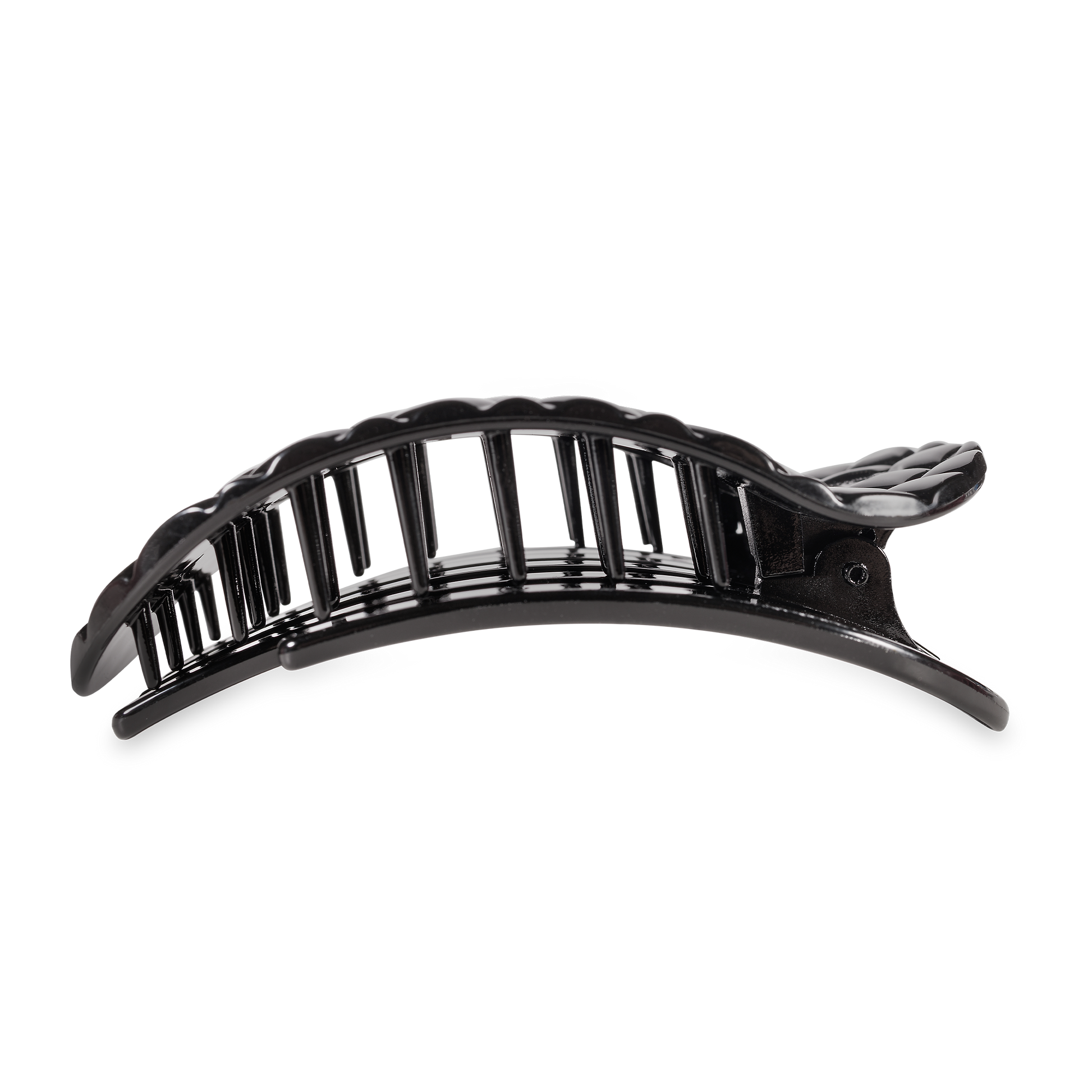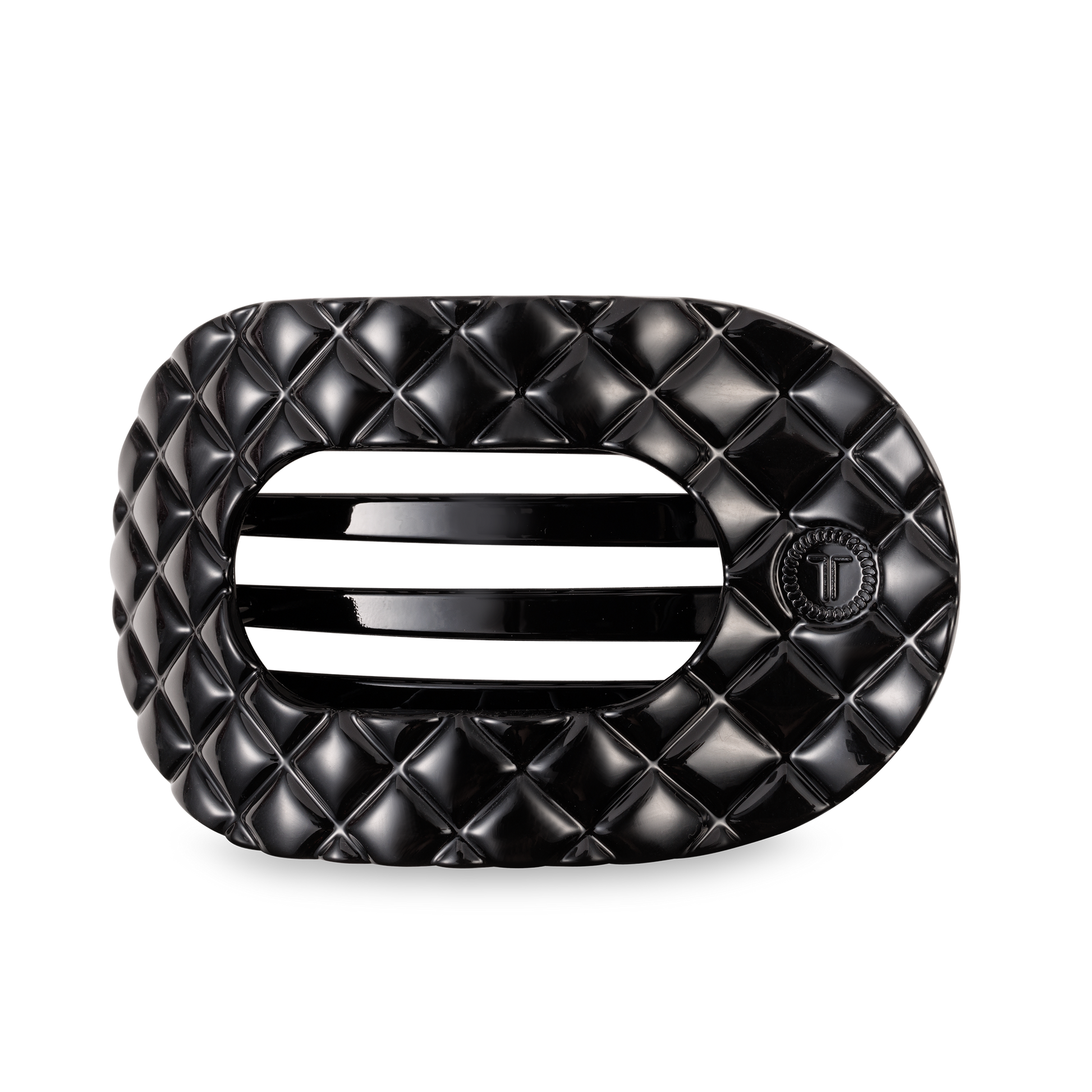 Lay flat and relax with the new TELETIES Jet Black Quilted Large Flat Round Hair Clip in Black. This hair clip is designed to allow you to lay back flat, do yoga, or sit comfortably in a seat with a headrest, and it is made with the same material that is nearly unbreakable. Lay down flat with comfort Bendable teeth for a secure yet gentle hold Lightweight, durable, and suitable for all hair types Perfect for all-day wear—from sunup to sundown The large size is 4.25 inches long.