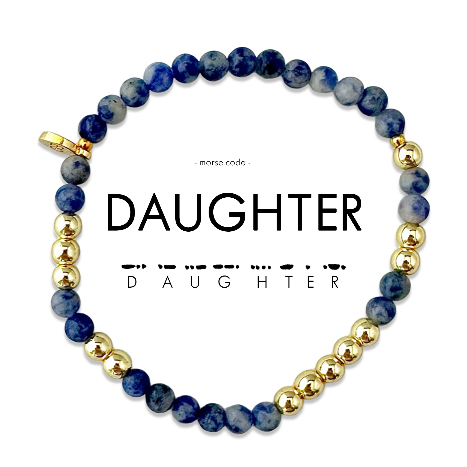 DAUGHTER The Greatest Gift. Every woman is a daughter and therefore one of the sweetest and greatest joys to those around them! This bracelet looks great alone or stacked with your other favorite Morse Code or stone stacking bracelets! This best selling Morse Code bracelet is now available in a classic gold color combination! The gold hematite beads are known to help keep you grounded and calm. How to read your jewelry: A Morse Code dot is one bead and a dash is two beads in the alternating color. Start at the small gold spacer bead and follow the Morse Code spelling around the bracelet! Your purchase helps to provide economic empowerment for women who are survivors of human trafficking and exploitation.