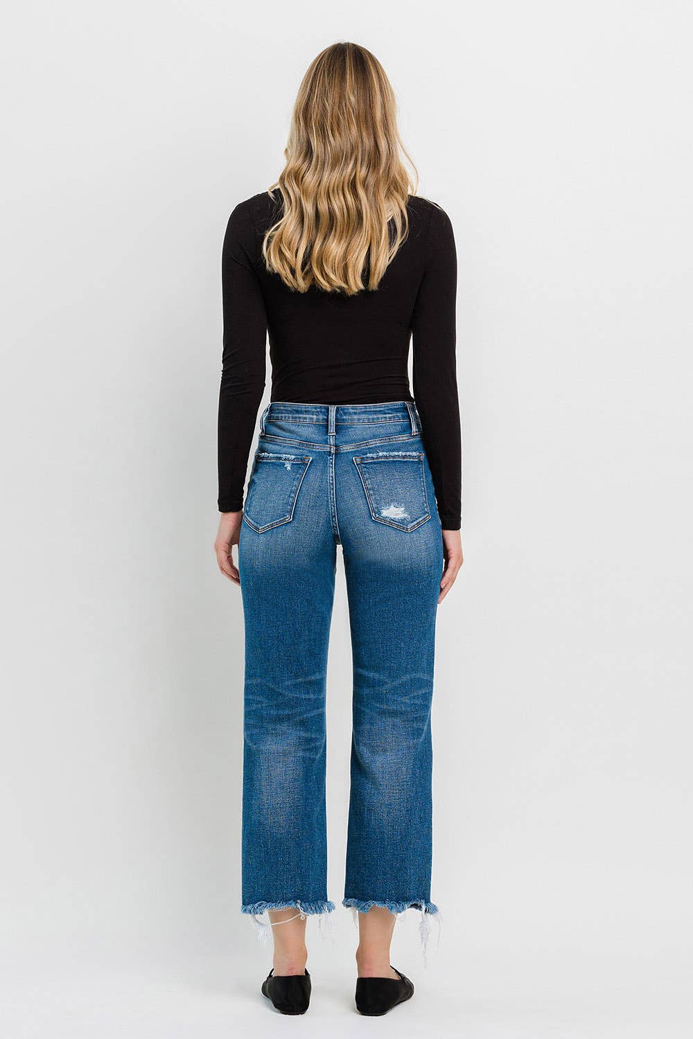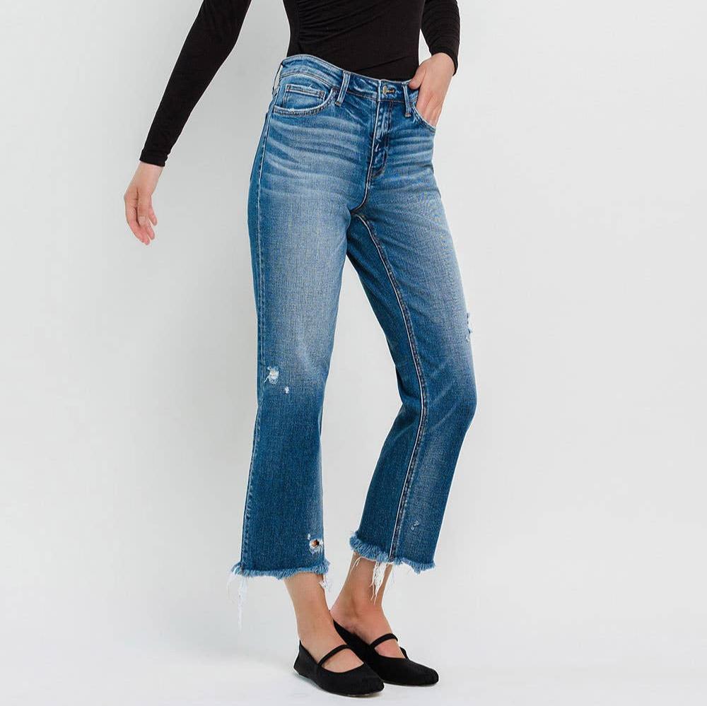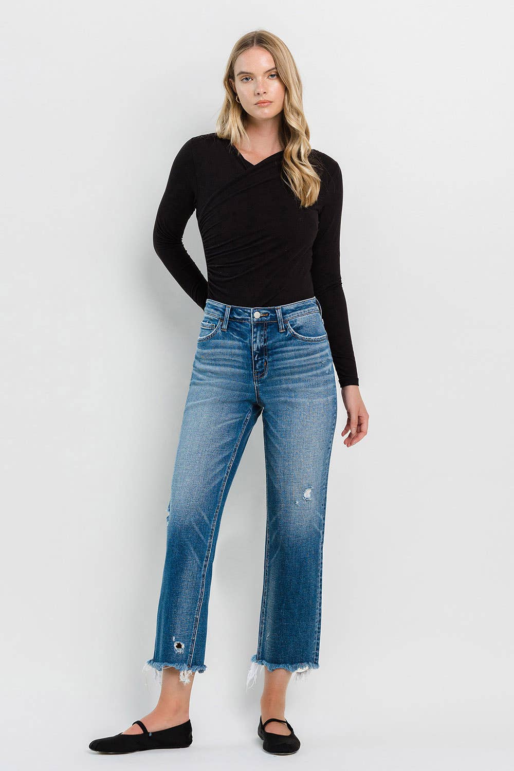 Put a little playfulness into your wardrobe with our High Rise Crop Straight Jeans. Their slight distressing gives them an edgy flair, while the raw hem adds a touch of uniqueness. Their flattering fit will make them your go-to for any casual day out. Dare to be different with these jeans!