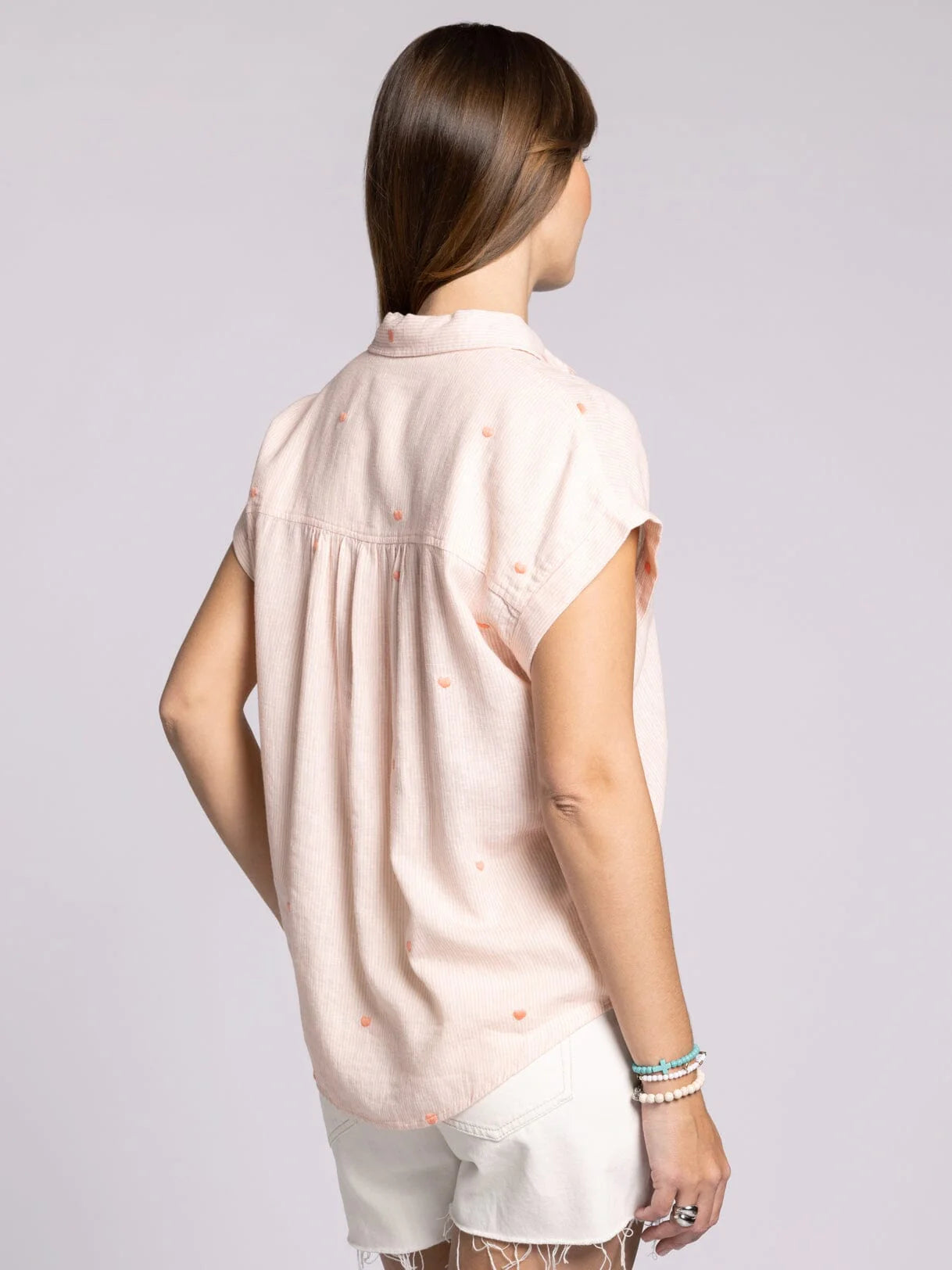 Meet the Jane short sleeve button-down top, your go-to for Spring layering. This beautiful top features a subtle heart embroidery pattern, drop hem in back, in a breezy viscose/linen fabric.