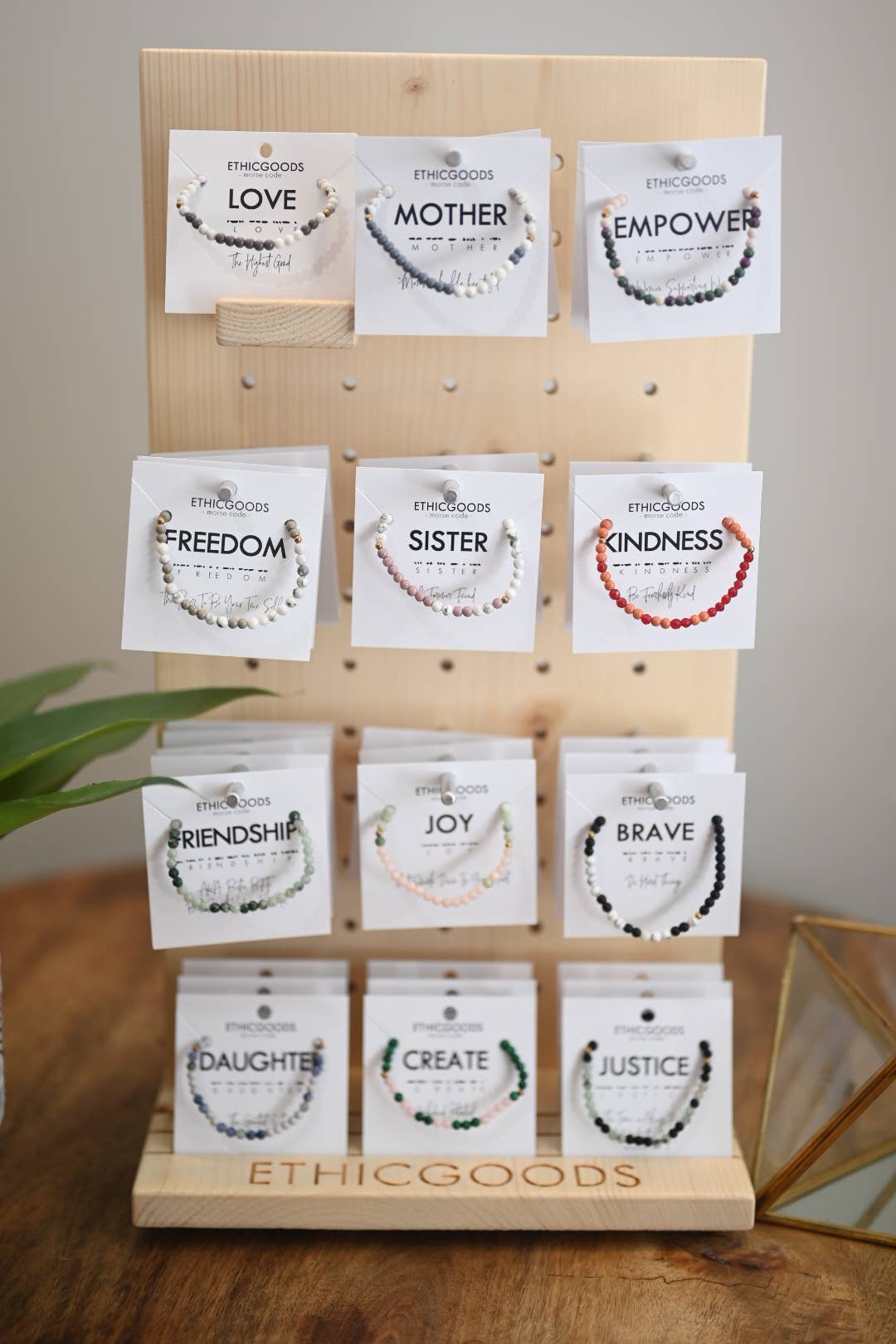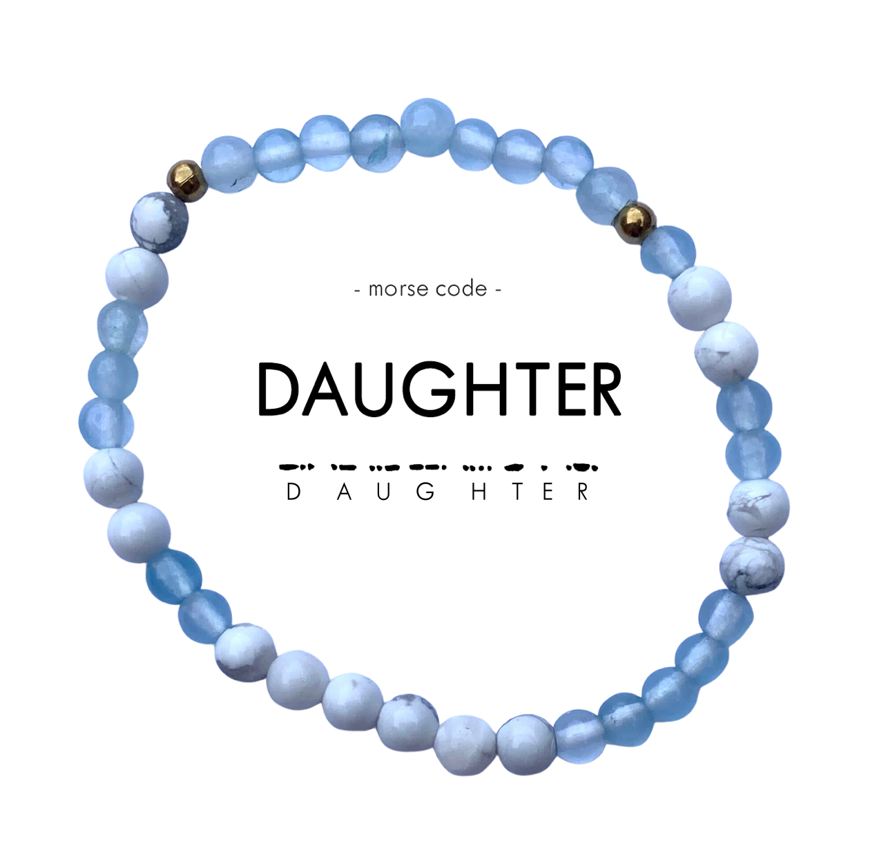 Each bracelet in our Thailand collection spells out an empowering word in morse code. Designed in DC and handmade by a woman impacted by trafficking in Thailand. Decode it: a dot is one bead, a dash is two beads! This mini bracelet is perfect for toddlers through elementary-aged kids and spells daughter: the greatest gift! Details: length - 5" | stretches to 6.5", handmade in Thailand, made with semi-precious stones, glass beads and elastic.