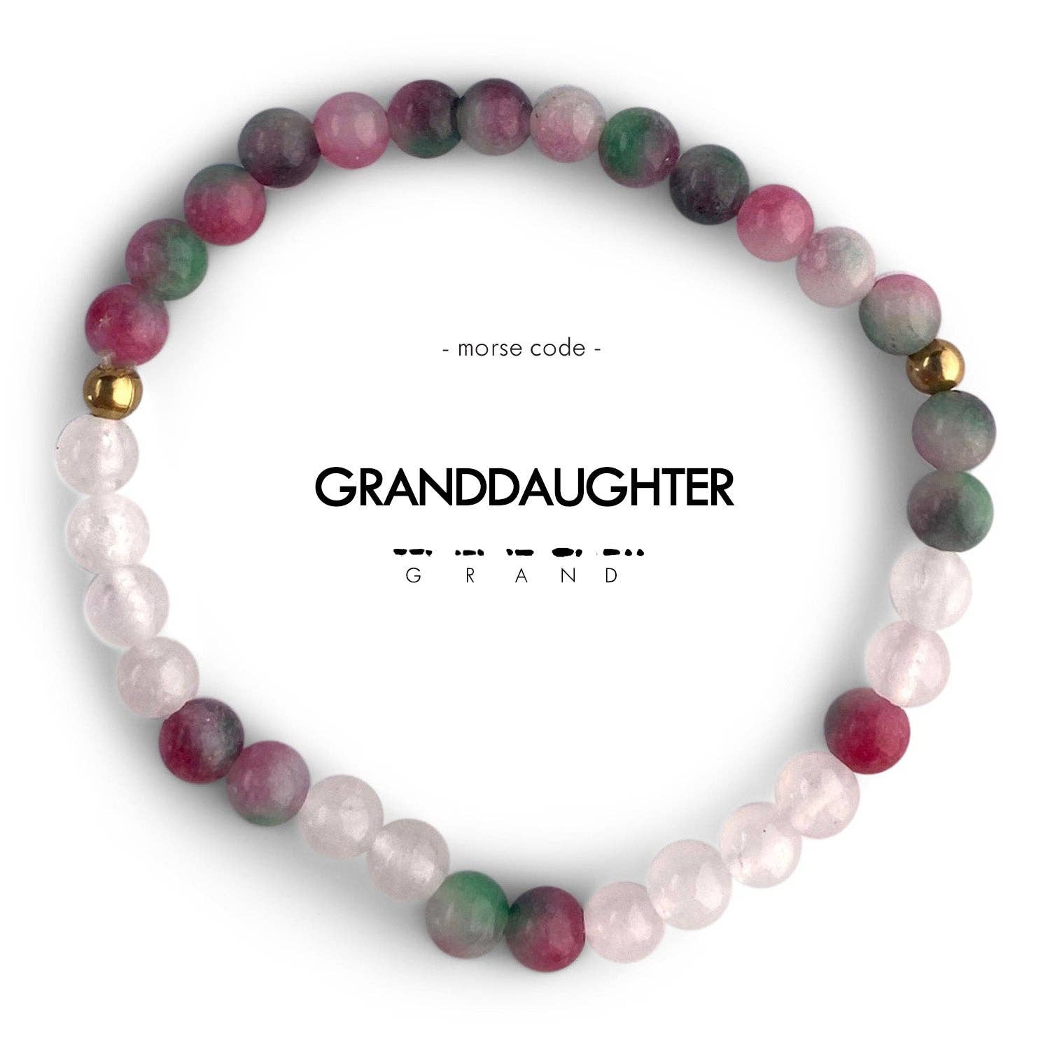 GRANDDAUGHTER Sugar spice and everything nice. This Morse Code bracelet is available in our MINI Collection! They are perfect for toddlers through elementary aged kids!  How to read your jewelry: A Morse Code dot is one bead and a dash is two beads in the alternating color. Start at the small gold spacer bead and follow the Morse Code spelling around the bracelet! Your purchase helps to provide economic empowerment for women who are survivors of human trafficking and exploitation. Each piece is handcrafted by the woman it helps to employ. Through wearing Ethic Goods, you become a meaningful part of her story, and give freedom to women around the world. Details * Length - 7.75" | Stretches to 8.5" * Handmade with love in Thailand * Made with semi-precious stones, hematite, glass beads, and elastic.