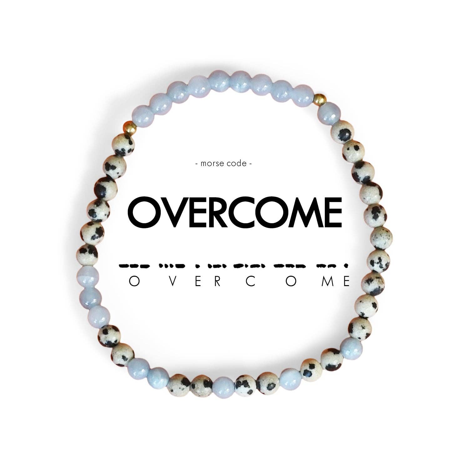 OVERCOME Stay in the fight. This bracelet spells OVERCOME in Morse Code in our classic 4mm beads! We all face obstacles in our lives. This bracelet is a perfect reminder to keep fighting, you can and will overcome! We’d love to hear what your jewelry means to you. Share your story and photos with us! @ethicgoods How to read your jewelry: A Morse Code dot is one bead and a dash is two beads in the alternating color. Start at the small gold spacer bead and follow the Morse Code spelling around the bracelet! Details * Length - 7.75" | Stretches to 8.5" * Handmade in Thailand by women who are survivors of human trafficking * Made with semi-precious stones, glass beads, elastic, and love.  * Decode it: a dot is one bead, a dash is two beads!