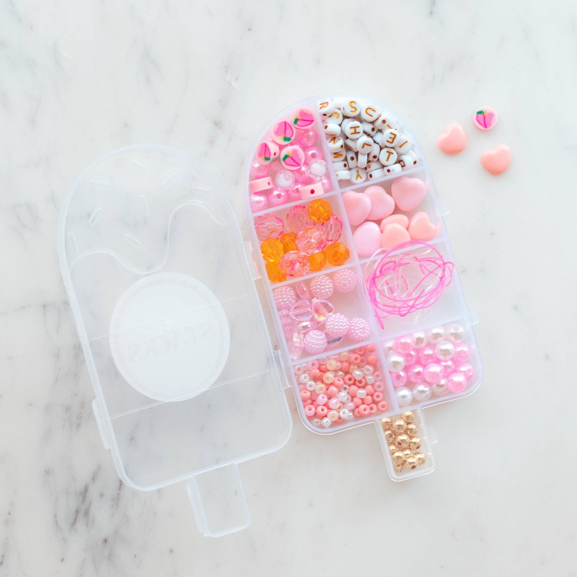 If you chose The Peachy Pop as your popsicle flavor, then you will be just peachy! This kit features peach fruit polymer clay beads, heart shaped beads, pink heart and star iridescent beads, pink pearls, and gold and white alphabet bead letters, and various other beads to add a little juicy POP to your little STACK. CHARM IT! If you would like charms added into your kit for an additional fee, feel free to visit our Charm Bar for more options! Popsicle flavors are also available in Rainbow Swirl, Lavender Freeze, Lemon Twist, Strawberry Shortcake, Orange Creamsicle, and Bomb Pop!  Each kit is subject to variation, please message us or email us at littlestacksco@gmail.com for a custom kit or a specific order. WARNING: CONTAINS SMALL PARTS AND MAY BE A CHOKING HAZARD FOR CHILDREN UNDER 3. ADULT SUPERVISION IS ADVISED.