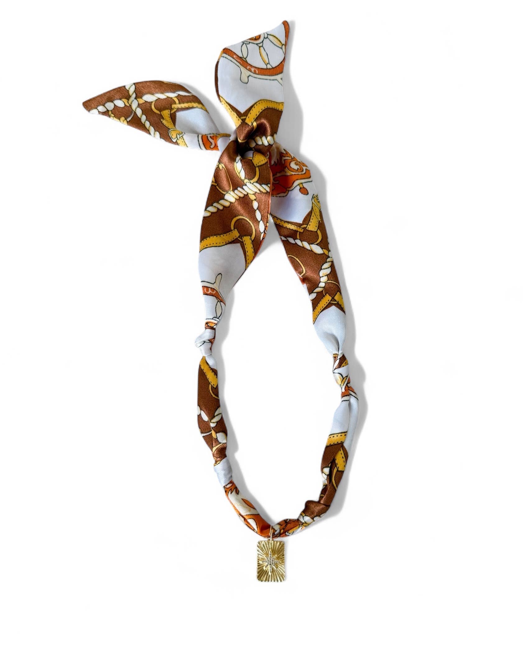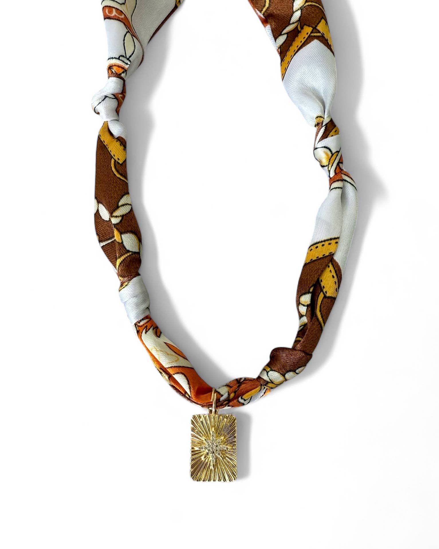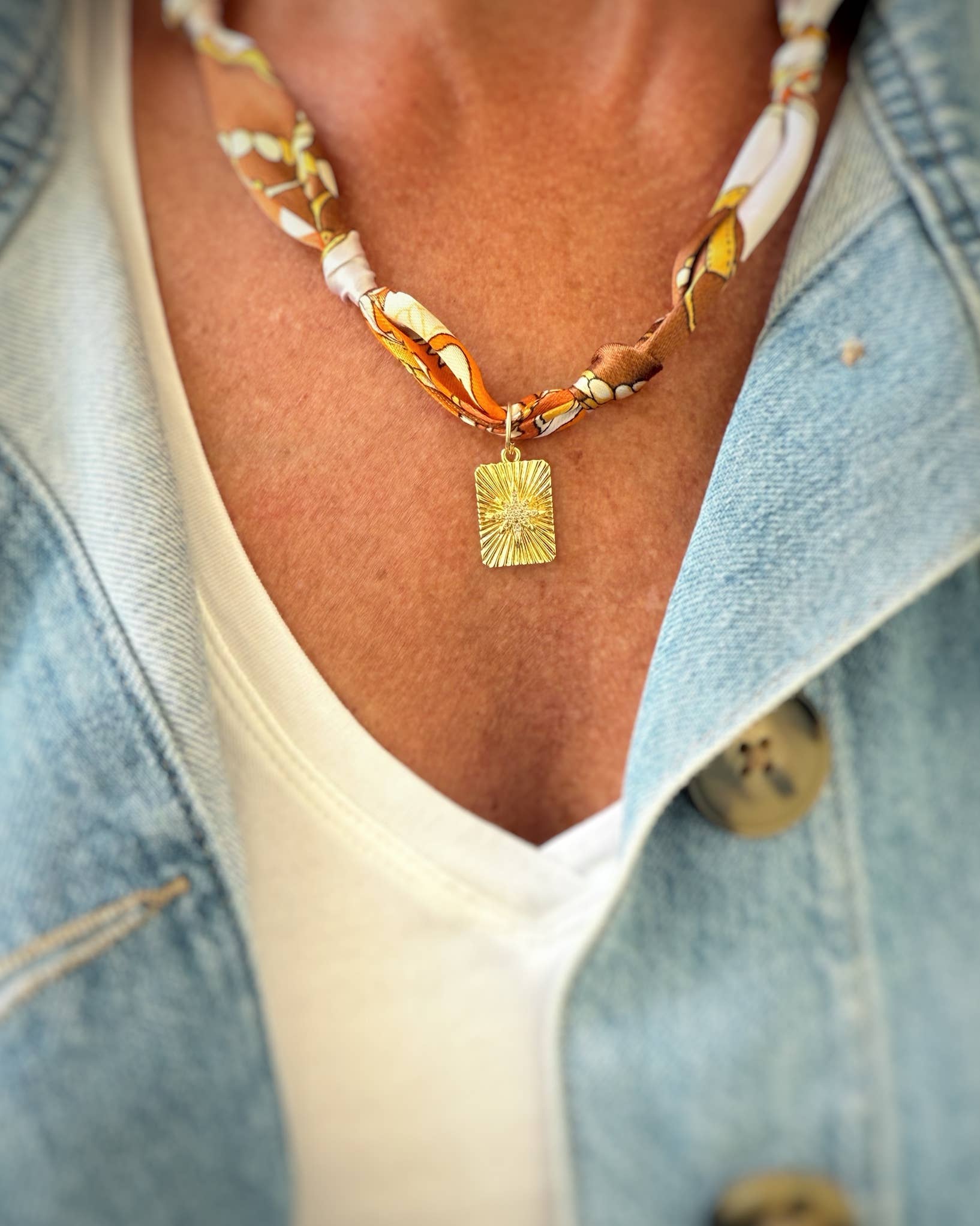 14k gold-filled pendant paired with soft faux silk scarf. - Length: up to 22'' depending on where you tie - Pendant: 3/4” - Handmade with the highest standards & quality materials.